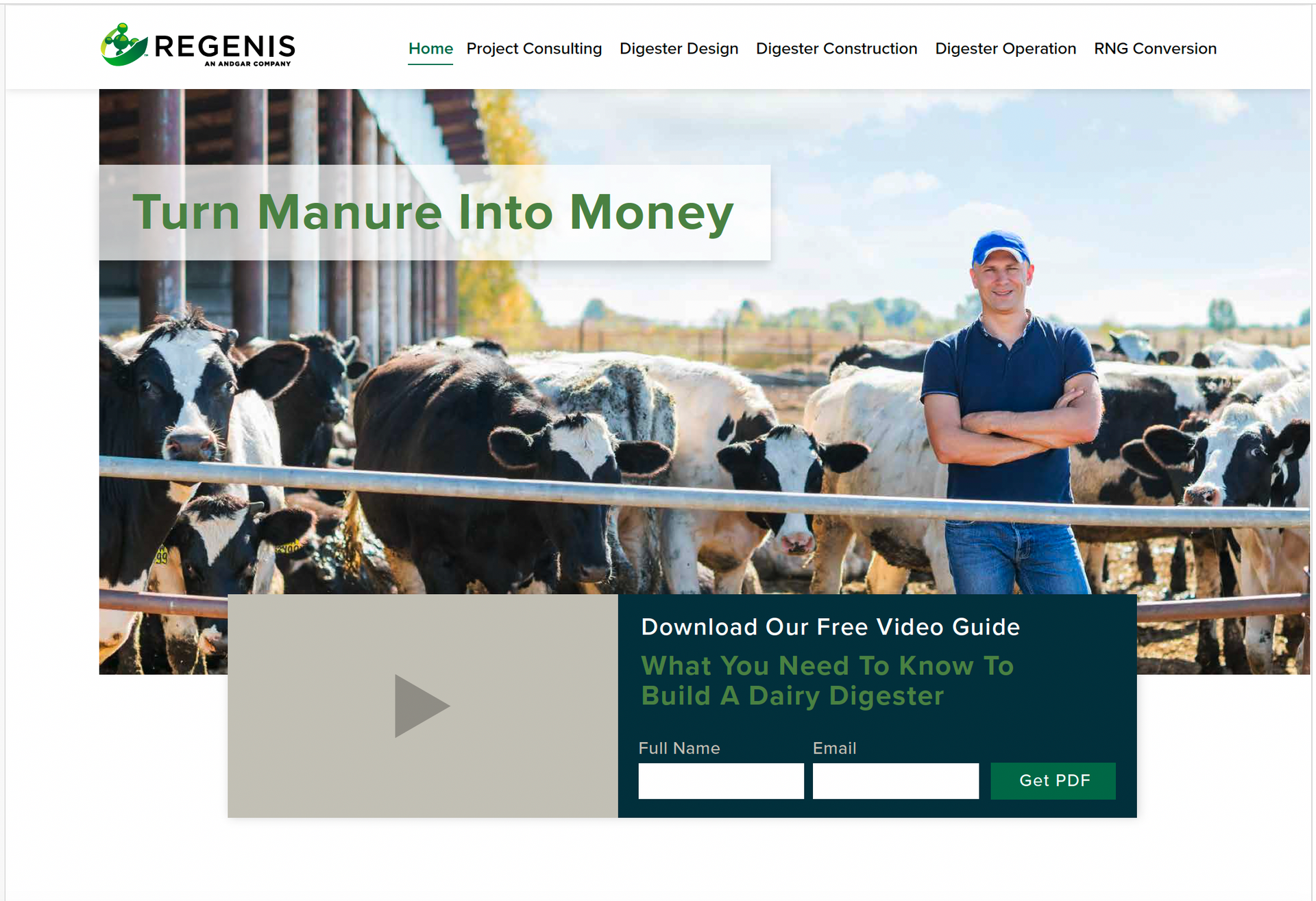 "Anaerobic digestion" doesn't drive many Google searches. To build visibility, the website was optimized for pain-point keywords like "biogas credit markets" and "how to sell biogas." A video course taught by one of America's foremost experts on nutrient recovery from dairy waste positioned Regenis as the industry authority while filtering out unqualified leads.