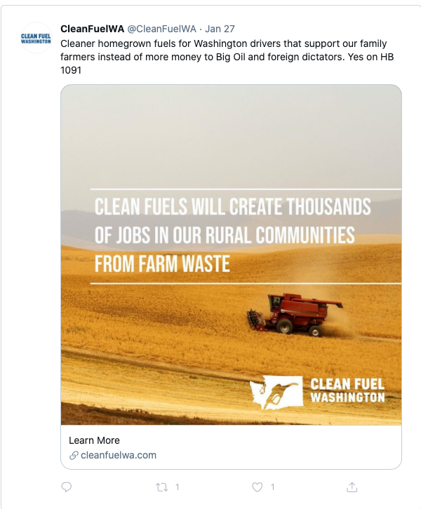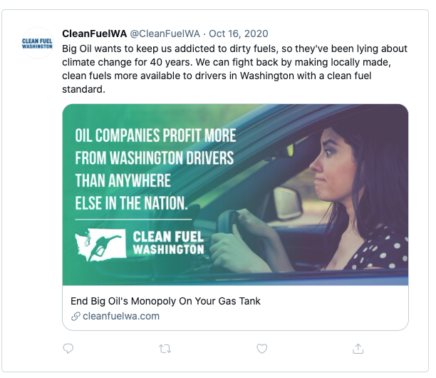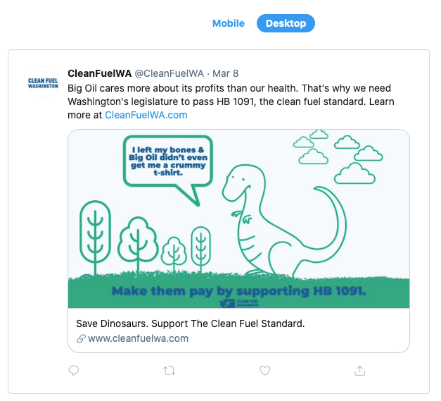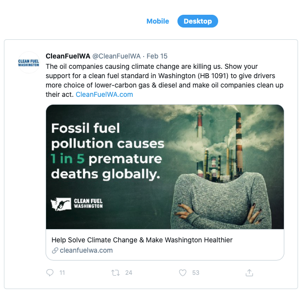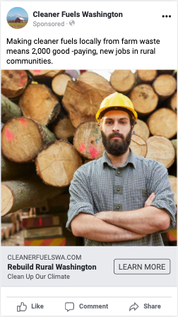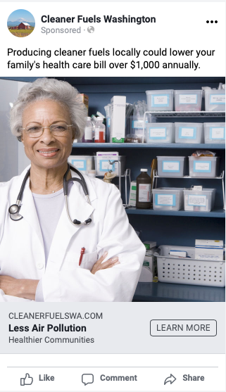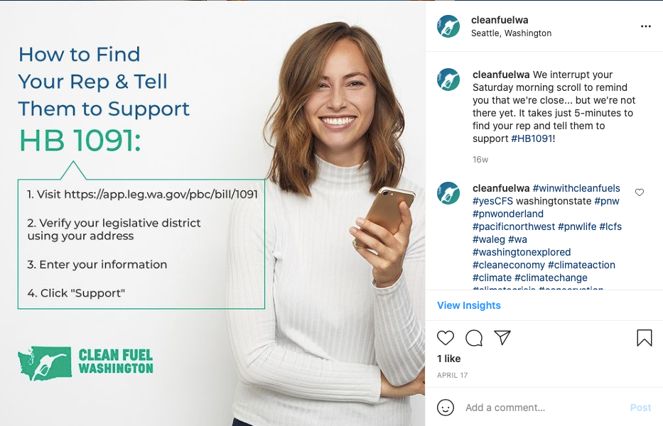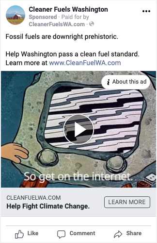 Campaigns on Twitter, Facebook, and Instagram had two objectives: build a grassroots base and counter Big Oil's industry front group that had successfully defeated environmental legislation for years. Targeted ads focused heavily on zip codes represented by wavering legislators, ensuring supporters would be their actual constituents. Search and display ads drove traffic to the website by targeting terms like "gas prices in Washington" and "greener gas and diesel."